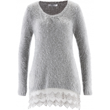 Langarm Long Pullover mit Spitze in grau für Damen von bonprix | Online bei INCURVY